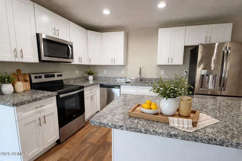 Listing details for 4649 38th Glen, Phoenix, AZ 85041 : Built in 2020, this beautifully upgraded 3 bed, 2 bath home offers modern living with style and comfort. Features include luxury wood laminate and new carpet in bedrooms. The spacious kitchen boasts granite countertops, stainless steel appliances, a large island with breakfast bar, and walk-in pantry. Open great room design is perfect for entertaining. The primary suite includes a double vanity, granite tops, and a huge walk-in shower. Situated on a desirable corner lot with a large backyard ready for your vision and a covered patio. Move-in ready and a must see!
