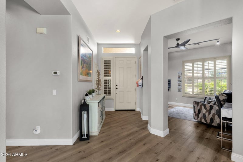 Listing details for 4680 Nightingale Ln, Gilbert, AZ 85298 : Very Special and Unique home situated on a Rare Spectacular #11 Par Three Golf Course Lot with approximately 9566 square feet, salt water pool and spa. The Aspen Model offers an open floor plan with spacious Great Room, 2 Bedrooms, an open Den/Office (could be used as a third bedroom) and 2 Bathrooms. The home has been remodeled with luxury vinyl flooring in all main areas, and new carpet in the bedrooms, plus plantation shutters throughout the home. The kitchen features a large quartz breakfast bar and counter, white glass backsplash, new sink and faucets, new appliances, new lighting, white cabinets, and a dining area with bay window overlooking the large patio, backyard and golf course. The master bedroom has its own full bath with tub, walk-in shower, double sinks, high counters and cabinets, new lighting and mirrors, walk-in closet, and has its own exit door to the patio and pool area. Your guests will enjoy their own bedroom and bath with walk-in shower, new cabinets and paint. Entertain in your resort style backyard with palm trees, refreshing pool and spa, and extended covered patio, with views of the Superstition Mountains, the green on hole 11, par3, and watch the golfers tee off. This is a rare North/South facing lot with only one neighbor, open space to the West and golf course behind you. Additional features are a new roof in 2023, new interior paint throughout, a convenient front porch patio, 2 security screen doors, and the laundry room includes washer and dryer. The 2.5 car garage has been extended, and has a side door to the trash can area, and plenty of built-in cabinets. Come enjoy all this property and home have to offer in this 55 plus active adult community of trilogy at Power Ranch and all the amenities, such as golf, pickleball, tennis, Bocce, pools, clubs, work-out facility and so much more.