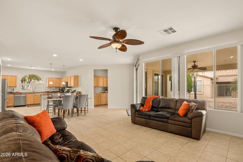 Listing details for 4696 Carob Dr, Gilbert, AZ 85298 : Wonderful Morningstar model at 1604asf with 2 bedrooms, den plus 2 baths. The interior has been freshly painted and the bedrooms have brand new carpet. The great room features a cozy gas fireplace and view windows to the backyard. The kitchen has granite counters, pantry, stainless appliances plus a breakfast bar. This popular split floor plan has a roomy primary suite and bathroom with double sinks and walk in shower. The secondary bedroom has a view of the front yard. Extended covered patio is wonderful for relaxing or entertaining with friends and family. Fully fenced! NEW Roof underlayment 2021. Wonderful amenities, pools, spa, pickleball, tennis, golf, bocce ball, clubs, restaurant, fitness center too. Close to shopping & dining.