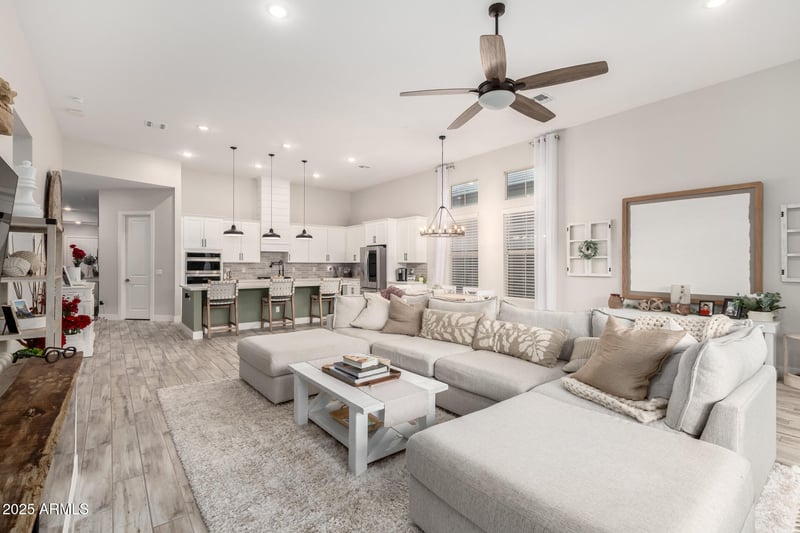 Experience resort-style living in this stunning single-level model home located in a private gated community within the award-winning Verrado master-planned community in Buckeye, Arizona. Designed with 12-foot ceilings and custom finishes throughout, this home offers an open-concept layout featuring a chef's kitchen, large center island, and an expansive great room, perfect for entertaining or everyday living. The split floor plan provides comfort and privacy, while every detail showcases exceptional craftsmanship and modern design. Step outside to your resort-inspired backyard complete with a sparkling pool, custom pergola, covered patio, and breathtaking mountain views. Located in the heart of Verrado, residents enjoy access to dozens of parks, miles of hiking and biking trails, two golf courses, top-rated schools, and the charming Main Street district with dining, shops, and community events. If you're searching for a luxury home for sale in Verrado with mountain views, a pool, and gated privacy, this designer retreat offers the perfect blend of sophistication, space, and Arizona lifestyle.