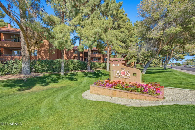 Listing details for 4704 Paradise Village Pw #303, Phoenix, AZ 85032 : Top-floor living with no one above in a prime Phoenix location with unmatched convenience just steps from the newly reimagined PV Mall, dining & shopping. This well-maintained condo offers a light, open layout with spacious living & dining areas, cozy fireplace & private covered balcony surrounded by mature Pine trees. Kitchen features granite counters, ample cabinetry & stainless appliances. Enjoy Split bedrooms, in-unit laundry, new HVAC and a true lock-and-leave lifestyle. Furnishings available for a turnkey option. Perfect as a primary residence, seasonal retreat or investment in a highly convenient North Phoenix setting. Taos gated community features a heated pool/spa, BBQ area, clubhouse w/ fitness center, pool table & lounge area. Quick & easy access to SR 51, downtown & Airport!
