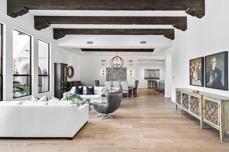 Listing details for 4725 Launfal Ave, Phoenix, AZ 85018 : Located in the heart of Arcadia Proper with breathtaking views of Camelback Mountain, this exceptional two-story estate sits within the highly sought-after Hopi School District and features a detached guest house complete with a kitchenette--perfect for visitors or multi-generational living. Inside, the home showcases soaring ceilings, arched entryways, and white oak wood flooring throughout. The open-concept layout seamlessly connects the main living spaces, highlighted by a formal dining area with exposed wood beams and a stunning wall of windows that fills the home with natural light. The chef's kitchen is a true centerpiece, equipped with high-end appliances, custom cabinetry, a gas range, multiple ovens, two islands, and a wet bar with wine refrigerator. The adjoining family room features a gas fireplace and a wall of sliding doors that create effortless indoor-outdoor living. The primary suite offers a private retreat with paneled walls, wood-accented ceilings, its own gas fireplace, dual walk-in closets, and direct backyard access. The spa-inspired bathroom includes a jetted soaking tub, dual vanities, and a private water closet. The resort-style backyard is designed for entertaining, featuring a custom pool and spa with water feature, outdoor kitchen, and multiple covered and uncovered patio areas. Expansive grassy areas complete the outdoor space, offering both beauty and functionality. Additional features include a home theater, gym with sauna, dedicated office, and a versatile bonus room ideal for a playroom, game room, or additional workspace. A four-car garage and ample additional parking add convenience. This is a rare opportunity to own in one of Phoenix's most desirable neighborhoods, just minutes from fine dining, shopping, resorts, and golf.