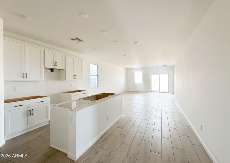 Throughout the main living areas, 8 x 36 Windsor Honey tile flooring offers a warm, cohesive flow, while the bedrooms feature plush carpeting for comfort and relaxation. Escape to your own oasis in the primary suite, where getting ready is a breeze with dual sinks, a walk-in closet, and a generously sized bedroom. This home feels bright and open thanks to the open-concept layout and 9-foot ceilings. The open floor plan and a sliding glass door effortlessly connect the indoor and outdoor spaces, creating an ideal setting for entertaining. Step out onto the covered patio and bask in the true essence of the indoor-outdoor lifestyle that Arizona is renowned for.