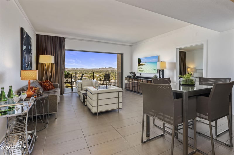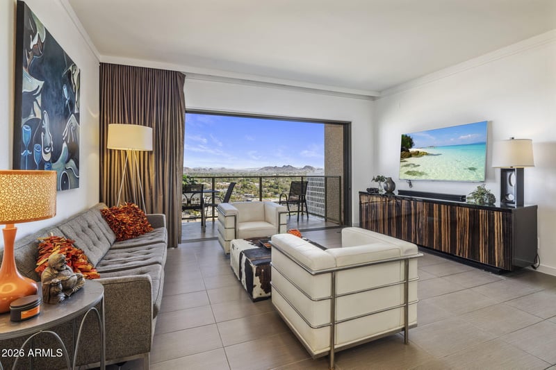 Listing details for 4750 Central Ave #17S, Phoenix, AZ 85012 : One of the largest residences in Landmark Tower, this expansive 2-bedroom, 2-bath condo was originally two separate units thoughtfully combined to create a spacious, open layout. Located on the 17th floor--just below the top--this home offers an elevated living experience with a split primary floor plan for added privacy. Upgraded floor to ceiling sliding glass doors in every room provide abundant natural light and seamless access to your balconies. Each room opens directly to the outdoors, offering unobstructed north-facing views of the Phoenix skyline and surrounding mountains--creating a true indoor-outdoor living experience. Additional highlights include fresh interior paint, an updated primary closet and bathroom, and a clean mid-century urban aesthetic. A rare find in the community, this unit includes two garage parking spaces. Landmark Tower amenities include a pool, gym, library, rooftop lounge, concierge desk, theatre, and multiple community spaces. Light rail access is just outside the building, with AJ's, fine dining, shopping, and entertainment just minutes away. Furniture available under separate bill of sale.
