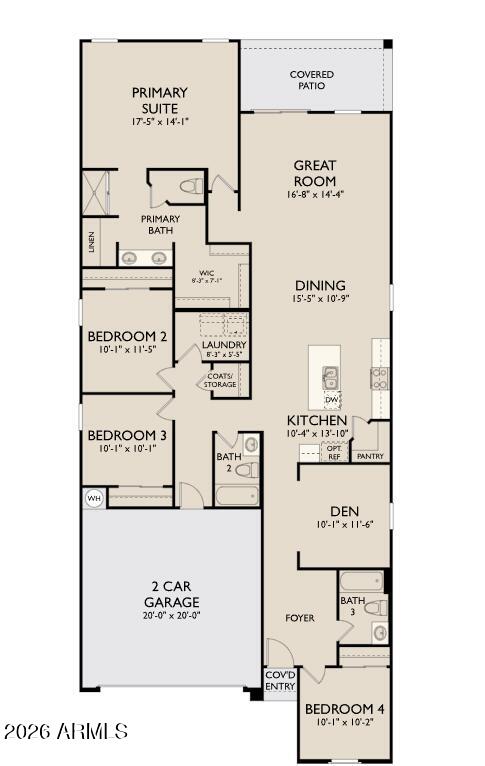 Throughout the main living areas, 8 x 36 Windsor Honey tile flooring offers a warm, cohesive flow, while the bedrooms feature plush carpeting for comfort and relaxation. Escape to your own oasis in the primary suite, where getting ready is a breeze with dual sinks, a walk-in closet, and a generously sized bedroom. This home feels bright and open thanks to the open-concept layout and 9-foot ceilings. The open floor plan and a sliding glass door effortlessly connect the indoor and outdoor spaces, creating an ideal setting for entertaining. Step out onto the covered patio and bask in the true essence of the indoor-outdoor lifestyle that Arizona is renowned for.