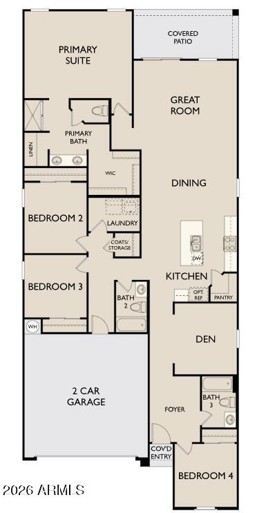 Listing details for 47651 Kenner Dr, Maricopa, AZ 85139 : The Poppy at Alba at Amarillo Creek offers 2,082 sq ft with 4 beds, 3 baths, an open den, and a 2-car garage. This Modern-style home features an open kitchen, dining, and great room, plus a private primary suite with a large bath and walk-in closet. Upgrades include the Milan Collection with grey 42'' cabinets with satin nickel pulls, White Sand quartz counters in both the kitchen and bathrooms, 4 x 16 Arnold white backsplash and Lakewood Vista 8 x 36 wood-plank tile. Plush carpet in the den and bedrooms. Home comes move-in ready with GE stainless appliances, washer, dryer, blinds and pendant prewires. Community amenities include parks, trails, pickleball, basketball, tot lots, and green spaces.