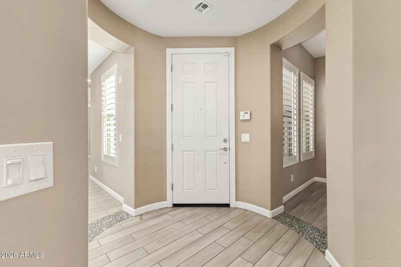 Listing details for 4777 Fulton Ranch Blvd #1068, Chandler, AZ 85248 : Rare & desirable ground-floor, single-level 'Villa 2' model in the prestigious gated community of Serenity Shores at Fulton Ranch. Enjoy luxury, security, and convenience with resort-style living. Inside you'll find wood-look tile flooring, plantation shutters, high ceilings, and designer lighting throughout. The open layout centers around a gourmet kitchen with upgraded GE Profile stainless steel appliances, gas cooktop, white cabinets with pull-out drawers, granite countertops, subway tile backsplash, and an island with breakfast bar. Spacious living area opens to a private covered patio for relaxing, while a separate dining space is perfect for hosting. Primary suite features dual sink vanity, soaking tub, separate shower, walk-in closet, and direct patio access. Two additional bedrooms and bath are split from the primary for privacy. Attached two-car garage with built-in cabinets and epoxy flooring. Community amenities include heated pool and spa, fitness center, clubhouse, and walking paths. Conveniently located near dining, shopping, golf, and entertainment.