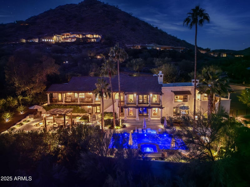 Listing details for 4801 Moonlight Way, Paradise Valley, AZ 85253 : A paved circular drive leads to this timeless Santa Barbara inspired hillside estate by Dave Hansen, perfectly positioned for sweeping Camelback & Mummy Mountain views. Every room opens to a patio or balcony, creating a seamless indoor-outdoor flow. The kitchen dazzles w/ marble countertops, butcher block island, LaCanche gas range, and picture window framing the views. Large main level primary suite is a retreat w/ wood floors, two fireplaces, sitting area, balcony & dual his and hers baths with skylit closets. Elegant living room has high beamed ceilings and fireplace open to an office w/corner fireplace. Downstairs opens to a resort style backyard w/ new pool/spa, BBQ, and multiple patios. Spacious family room w/3 add'l bedrooms/2 baths-a perfect blend of beauty, comfort and views!