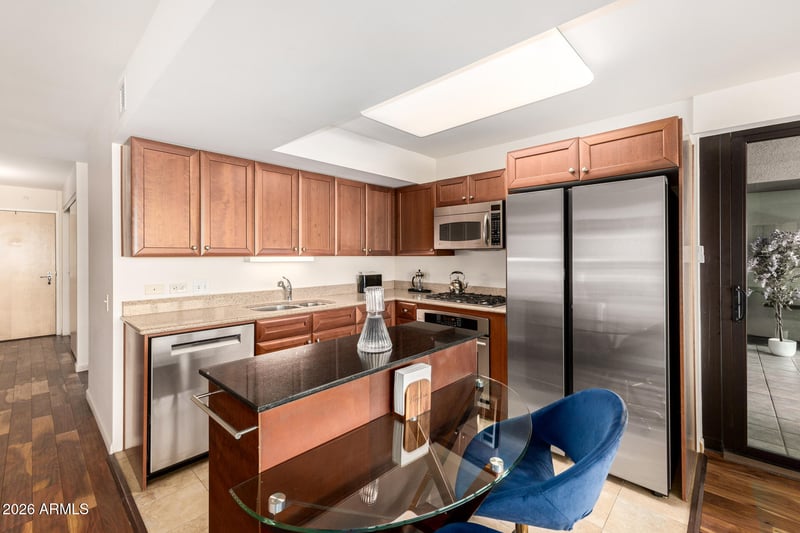 Listing details for 4808 24th St #1402, Phoenix, AZ 85016 : Sophisticated high-rise living in one of Phoenix's premier locations, 14th floor executive condo at Optima Biltmore Towers! Furnished & upgraded for comfort & style, this 1BR 1BA suite has extraordinary views from city lights to surrounding mountain views. The floor-to-ceiling windows bring in natural light, beauty, & a sense of well-being. The open floor plan includes a spacious LR, KIT w/SS appliances, gas stove, granite counters, & center island, private covered patio, & primary BR suite w/walk-in closet & Bath. Rich hardwood & Travertine tile floors compliment the urban lifestyle. Newer appliances include Samsung Bespoke Ref & Bosch DW 2024 & LG smart W/D 2023. Classy Closet designs in both Hall & Primary BR closets. Summer 2026, the prestigious new rooftop pool by Bradford Pools will open! It is finally here awaiting its debut! Optima amenities include fitness center, steam room, concierge services, expansive common areas, & rooftop retreat. In addition, enjoy ample guest parking, personal storage unit, & secure, 24-hour monitored garage parking w/an assigned space on P3 near the elevator. This phenomenal opportunity & value is exceptional for Optima's high-end Biltmore location!