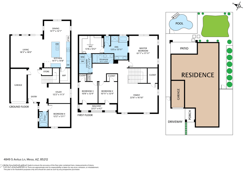Listing details for 4849 Avitus Ln, Mesa, AZ 85212 : Located on a large corner lot in Eastmark with 4 bedrooms, a loft, den, great room, open kitchen with island, walk in pantry, dining area, pool with slide and travertine surround, and a large backyard you're going to love this house! The welcoming entry draws your eye past the downstairs bed and full bath, by the den thru the kitchen to the beautiful backyard pool. The kitchen has stainless appliances, a large island with storage underneath, a big pantry and modern lighting. Upstairs you'll find the primary bedroom with large walk in closet, 2 other bedrooms also with walk-ins, a huge loft and the laundry room. You'll enjoy the private lot, travertine patio, pool with slide and waterfall, large turf area and more. Add the 3 car tandem garage with storage plus all that Eastmark has to offer