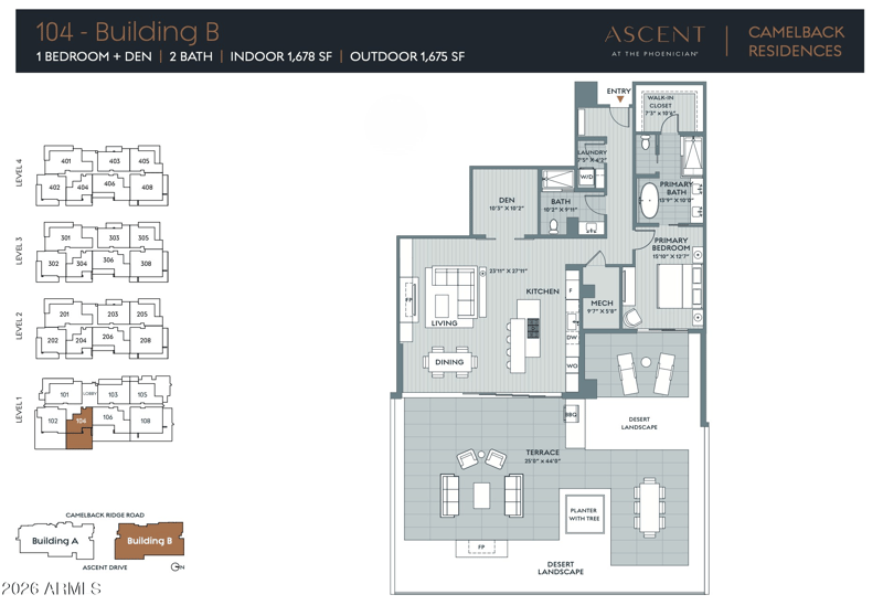 Listing details for 4849 Camelback Ridge Rd #B104, Scottsdale, AZ 85251 : Welcome to Ascent at the Phoenician - world class modern living at its finest! This BRAND NEW, NEVER BEEN LIVED IN luxury residence features 1 bedroom plus a den, 2 full bathrooms plus an extraordinary 1,600-sq-ft private garden/yard — the only one-bedroom unit that has one and a feature rarely found within the community. The interior features showcase the highest end of finishes with Bulthaup kitchen, European oak floors, Wolf/SubZero appliances, Waterworks fixtures, Lutron roller shades, Soaring ceilings, natural light and designer finishes set the tone in this sophisticated, modern unit. An expansive wall of glass seamlessly opens up for indoor/outdoor living with tons of entertaining space, outdoor fireplace and built-in BBQ. This exclusive address also offers access to the Phoenician Resort, guard-gated entry gate to the community, secure 2-car parking, private storage area, and the exclusive Mountain Club - a private club for owners with fitness and movement room, party room, kitchen, private pool, and rooftop terrace with 360 degree views of Camelback Mountain, downtown Phoenix and the Valley of the Sun. PROFESSIONALLY DESIGNED FULL-FURNITURE PACKAGE AVAILABLE FOR SALE.