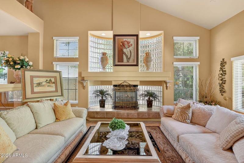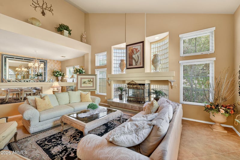 Listing details for 4850 Hudson Pl, Chandler, AZ 85249 : This beautifully maintained single-owner home offers privacy with green belt behind. Soaring cathedral ceilings, expansive living spaces and large bedrooms ideal for zestful living. The remodeled kitchen features high-end finishes and flows into multiple living and dining areas, including a private downstairs bedroom with en-suite bath. Upstairs offers a massive loft with balcony. The luxurious primary suite features dual walk-in closets, a two-way gas fireplace, soaking tub, and glass-enclosed shower. The backyard is an entertainer's dream with a built-in BBQ, covered patio, fruit trees, and saltwater pool with spa. Conveniently located near Loop 202, top-rated schools, parks, shopping, and dining, this home offers the perfect blend of comfort, location, and lifestyle.