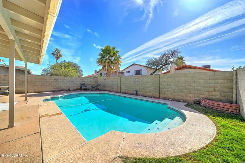 Listing details for 4915 Evans Dr, Glendale, AZ 85306 : This beautifully updated & well maintained home is a must see. It features a sparkling backyard pool, covered patio, lush side courtyard, an excellent split floorplan, & soaring vaulted ceilings. Primary suite has jetted tub, double sinks, and walk in closet. The remaining bedrooms & bath at the other end of the house are perfect for guests, renters, etc. New cabinets in kitchen & bathrooms. The property is fenced by a block wall which instills feelings of privacy, tranquility, and security. Brand new vinyl windows in every room bring in natural light and help with energy efficiency. A Rooftop Solar panel heats the water and saves wear and tear on water heater. All appliances convey. Easy access to the 17 & 101 Freeways, Schools, Hospitals, shopping & entertainment. Owner is RE agent.