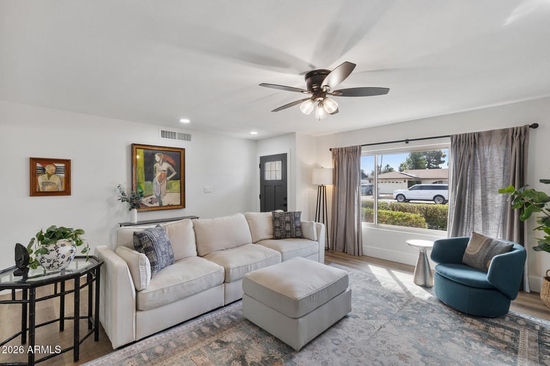 Listing details for 4932 Evans Dr, Scottsdale, AZ 85254 : Light-filled Central Scottsdale gem with NO HOA! Fully remodeled with roughly $60,000 in upgrades (2024-2025), including a new roof (2024) & EV charger! This home features LVP flooring that flows through the main living areas; a large formal living room off the front entry that opens seamlessly into the family room featuring vaulted ceilings, dining space & an upgraded kitchen with white cabinetry, quartz countertops, tile backsplash, stainless steel appliances, breakfast bar seating, walk-in pantry, plus a dining room buffet with wine rack & extra cabinetry for added storage. A large sliding door leads to the backyard, creating easy indoor/outdoor living. The primary suite offers direct backyard access, a double-vanity ensuite, walk-in shower & walk-in closet. Other two good sized secondary bedrooms share an updated hall bath. Outside, enjoy a spacious covered patio with wood-like flooring, turf landscaping & block fencing, perfect for relaxing now or customizing later. Ideally located in Scottsdale within the Paradise Valley Unified School District, close to shopping, dining & recreation, this move-in ready home blends comfort, style & unbeatable convenience.
