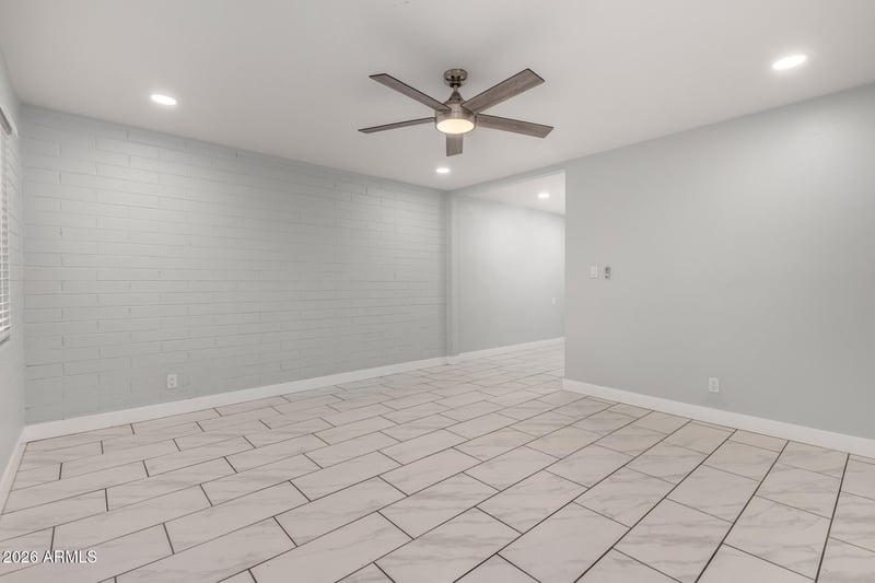 Listing details for 4938 Mclellan Rd, Glendale, AZ 85301 : Freshly renovated, with no HOA this single-story home offers comfort inside and out! A fenced front yard welcomes you with an extended driveway and carport parking for added convenience. Inside, discover an inviting living room, tile flooring throughout, thick baseboards, and recessed lighting for a bright, modern feel. The eat-in kitchen boasts white cabinetry, stainless steel appliances, quartz counters, and a matching backsplash, flowing seamlessly into a spacious family room perfect for intimate gatherings. Lovely main bedroom includes a private bathroom, providing a comfortable retreat. Outside, the large backyard features a covered patio and plenty of play space, making it ideal for entertaining, gardening, or simply enjoying the outdoors.