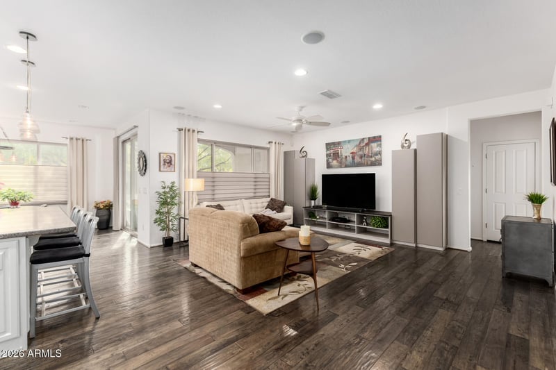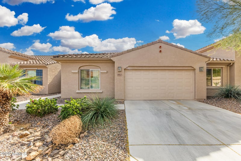 Listing details for 4943 Gulch Dr, Eloy, AZ 85131 : Furnished 2-bedroom, Den, 2 Bath home in Robson Ranch! Thoughtfully designed, the interior showcases an open floor plan with wood floors, contemporary lighting, premium home theater package w/speakers, perfect for entertaining, and stylish neutral tones. The kitchen comes equipped with ample cabinets, tile backsplash, stone counters, SS appliances, and an island. The serene main bedroom promises a good night's rest and features a walk-in closet and a bathroom with dual sinks. You'll find built-in shelves in the den, making it perfect for a home office. Out back, you can enjoy peaceful evenings under the cozy covered patio with well-laid pavers. Don't forget to visit the community's pool, spa, golf, clubhouse, and other amenities to fill your days with fun! Make this gem yours now, So many upgardes such as 42" white Maple cabinets w/upper & under cabinet lighting, new microwave, new dishwasher, soft close drawers, roll out shelves, high end appliances, pendant lights & backsplash. Remote controlled blinds, 4 solar tubes, custom closet systems. Guest bedroom with a Queen Size Murphy Bed. Garage has recirculating pump, water softener, epoxy flooring & built in cabinets. Note - ice-maker does not work.
