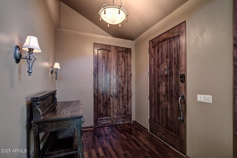 Listing details for 500 Grapevine Dr, Payson, AZ 85541 : Stunning Custom Home in Gated Chaparral Pines Golf Community - Payson, Arizona. Nestled in the woods of the prestigious gated Chaparral Pines community, this exquisite custom home offers the perfect balance of luxury, privacy, and resort-style living. Upon entry, you're greeted by soaring 20+ ft ceilings and a grand stone fireplace that sets a warm, welcoming tone. The expansive Pella windows throughout the home bring the beauty of nature indoors, filling each room with natural light and stunning views of the towering Ponderosa pines. With over 2,900 sq ft of meticulously designed living space, this home features dazzling Brazilian Cherry hardwood floors, solid Alder doors, and unique artistic touches that elevat The gourmet kitchen is a true centerpiece, boasting granite countertops, custom tile work, a wet bar, and a spacious walk-in pantry. Adjacent to the kitchen is an open dining area, perfect for entertaining, with easy access to a stylish powder room for guests. The master suite is a luxurious retreat on the main level, offering serene privacy and access to the back patio. Upstairs, two guest bedrooms each feature their own ensuite baths and walk-in closets, ensuring comfort for family and visitors. A cozy loft living area provides additional space for relaxation. Step outside and enjoy the privacy of the wrap-around porch, ideal for evening BBQs and surrounded by mature trees, including majestic pines. The upstairs deck offers breathtaking mountain views, making it the perfect spot for morning coffee or stargazing at night. Additional features include custom remote-controlled motorized blinds, wool Berber carpeting in the bedrooms, and custom wrought iron banisters. With its beautiful blend of rustic charm and refined elegance, this home is the perfect sanctuary for seasonal or full-time residents. If you're seeking the ultimate private getaway or year-round residence in Chaparral Pines, this home is truly a must-see!