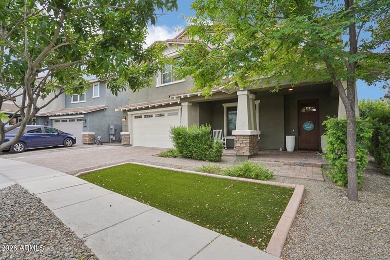 Listing details for 5051 Girard St, Gilbert, AZ 85298 : This gorgeous home backs to one of the streams and lakes within the highly desirable Bridges community. Relax and enjoy the newer-build pool and spa in the large backyard with no neighbors behind, and great views of the fireworks at Gilbert Regional on the Fourth of July! The north/south facing home is across from a greenbelt with a lovely front porch welcoming you. Once inside, you'll find plenty of room for everyone from the open entryway, high celings and flex space, to the large kitchen and beautiful coffered ceiling in family room. Kitchen upgrades include a huge island with plenty of seating around and quartz counters. One bedroom and full bath downstairs, plus a 1/2 bath. Upstairs is a open loft with a lovely circular bonus space, three additional bedrooms and a primary suite with split sinks, walk-in shower, separate tub and access to the laundry room from the large walk-in closet. Plenty of storage within the home with custom built-ins and a three-car tandem garage. This entertainer's dream home is truly special...make it YOURS before someone else does!
