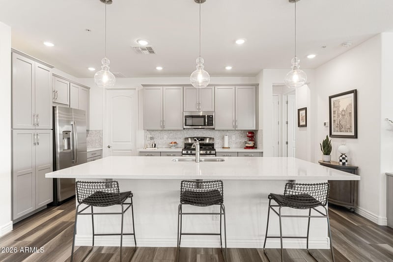 Listing details for 5100 Rancho Paloma Dr #2066, Cave Creek, AZ 85331 : Stunning, highly upgraded, gated condo designed with today's buyer in mind! Featuring an open-concept layout, designer finishes, abundant natural light, and beautiful tile flooring throughout this offers the perfect blend of modern style and comfort. The designer kitchen boasts sleek light grey cabinetry, premium appliances, quartz countertops, pantry and a spacious island ideal for entertaining. The split bedroom plan is ideal for privacy. The primary suite boasts an extended shower, dual sinks, & walk-in closet. The East facing balcony provides a cool and peaceful retreat. There is even an electric car charger and a water softener in the garage. Enjoy resort-style community amenities featuring a heated pool, hot tub, and gym close to dining/shopping and all that Cave Creek has to offer!