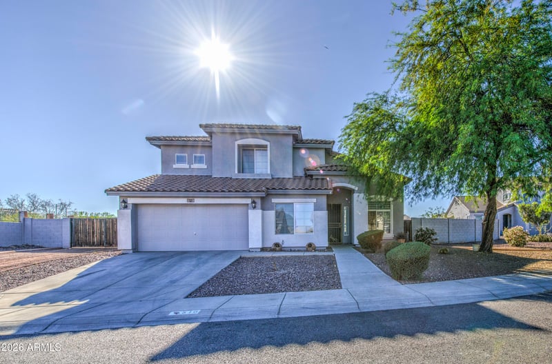 Listing details for 516 219th Dr, Buckeye, AZ 85326 : Spacious 5-bedroom, 3-bath home in the desirable Windmill Village community near parks, walking trails, and golf amenities. The functional layout includes a primary suite and additional bedroom on the main level, ideal for guests or multigenerational living. Upstairs features a large loft perfect for a game room, media space, or second living area. The primary suite offers a separate tub and shower with a walk-in closet. Tile and wood flooring enhance the main living areas, complemented by fresh interior and exterior paint. The oversized lot features an extended covered patio, RV access, outdoor cooking area, firepit, garden space, and convenient access to schools, shopping, and freeways.