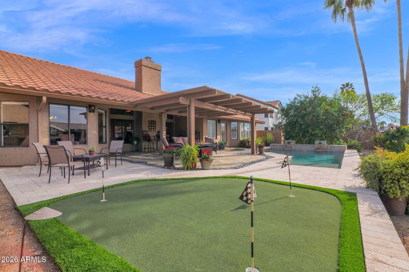 Listing details for 518 Lagoon Dr, Gilbert, AZ 85233 : 1 Story, Updated, Waterfront home in The Islands. Sparkling pool w waterfall & Baja shelf. Home features 3 beds + office (can be converted to 4th bed), Spacious LR & DR room. Cozy family room w fireplace open to kitchen w views to backyard. Primary bedroom has gorgeous ensuite w tub & walk-in tiled shower plus private exit to backyard. Backyard features spacious covered patio, pool, removable safety fence, putting green, Tangelo tree & fig tree, plus raised garden bed. Sellers invested over $250k in renovations over the years. Beautiful remodeled kitchen & baths, roof, AC, tile, landscaping, etc. ''The Islands'' community offers huge park w playgrounds, running track & sports courts & several events throughout the year: concerts in the park, boat parades, car show, and much more!