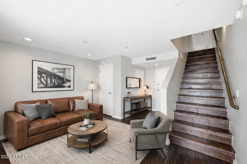 Listing details for 526 1st St #106, Tempe, AZ 85281 : Ideally located in the heart of Tempe, 526 W 1st St, Suite 106 offers convenient urban living just steps from Tempe Town Lake and minutes from Mill Avenue, ASU and the light rail. The ground level features a flexible open space with access to the tandem two-car garage, ideal for a home office, studio or additional living area. The main floor offers hardwood flooring, an open living area and a well-equipped kitchen with stainless steel appliances and granite countertops, plus a half bath and private balcony. Upstairs includes two bedrooms and two full bathrooms. Residents can enjoy resort-style amenities including a pool, spa, cabanas, barbecue area and outdoor shower- All just a short walk from the unit. A great opportunity to enjoy low-maintenance living in a prime Tempe location.