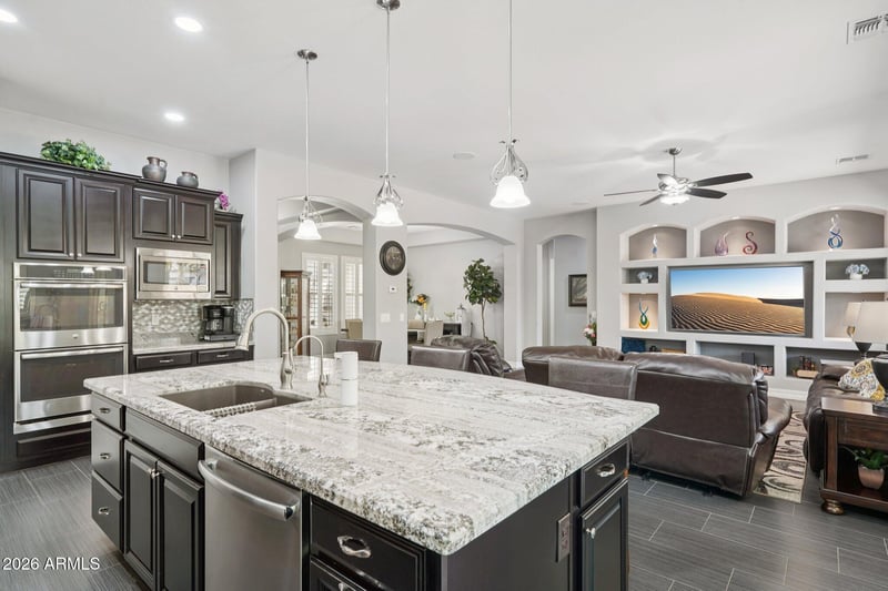 Listing details for 5285 Loback Ln, Gilbert, AZ 85298 : Spacious 4-bedroom, 2.5-bath home in The Bridges, one of South Gilbert's most desirable communities. This 3,000+ sq ft residence features an updated kitchen with quartz countertops, stainless steel appliances, and a center island open to the main living area. The oversized backyard offers room to entertain, play, or add a pool. A 3-car garage adds storage and flexibility. Upstairs, the primary suite includes a private en-suite bath alongside three additional bedrooms. The Bridges delivers tree-lined streets and a true neighborhood feel. San Tan Village is minutes away for shopping and dining. Gilbert, AZ 85298. The standout 3-car garage is a dream setup, featuring custom built-ins for organized storage and sleek epoxy flooring that adds both durability and a polished look, ideal for hobbies, a home gym, or simply keeping everything in its place. Step outside and unwind in your own private retreat, complete with a serene outdoor water feature that creates a calming atmosphere, perfect for relaxing evenings or entertaining guests. Beyond the home, the community truly shines. Enjoy access to beautifully maintained lakes, walking trails, playgrounds, and a splash pad, offering something for every stage of life, from morning walks to weekend fun. If you're looking for a home that combines thoughtful upgrades with a peaceful, amenity-rich setting, this one delivers.