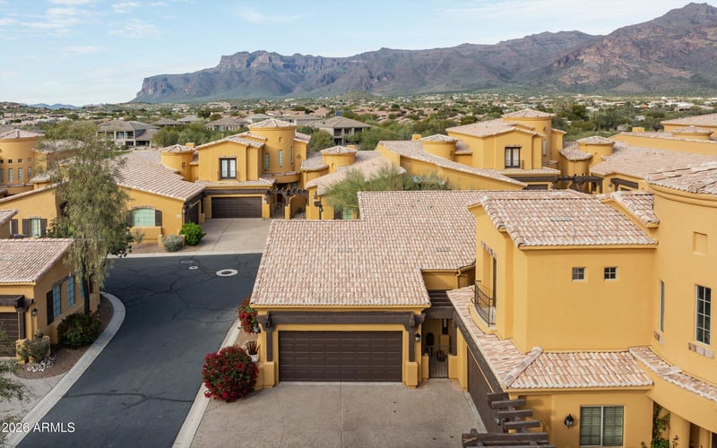 Listing details for 5370 Desert Dawn Dr #46, Gold Canyon, AZ 85118 : Welcome to Toscano Villas, a gated community with Tuscany charm, set against stunning Superstition Mountain views. This private end unit offers endless natural light, split bedrooms, and an open great room designed for everyday living and entertaining. The spacious kitchen features a center island with breakfast bar, generous cabinetry, and an adjacent dining area that flows seamlessly into the main living space with a cozy fireplace. The primary suite is a true retreat with patio access, a walk-in closet, dual vanities, a soaking tub, and a walk-in shower. Additional highlights include a two-car garage, a private courtyard, and private patio that enhances the home's indoor/outdoor lifestyle. Enjoy resort style amenities including a clubhouse, fitness center, and heated pool and spa.