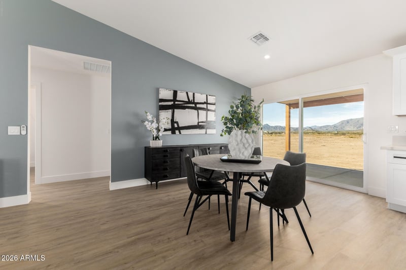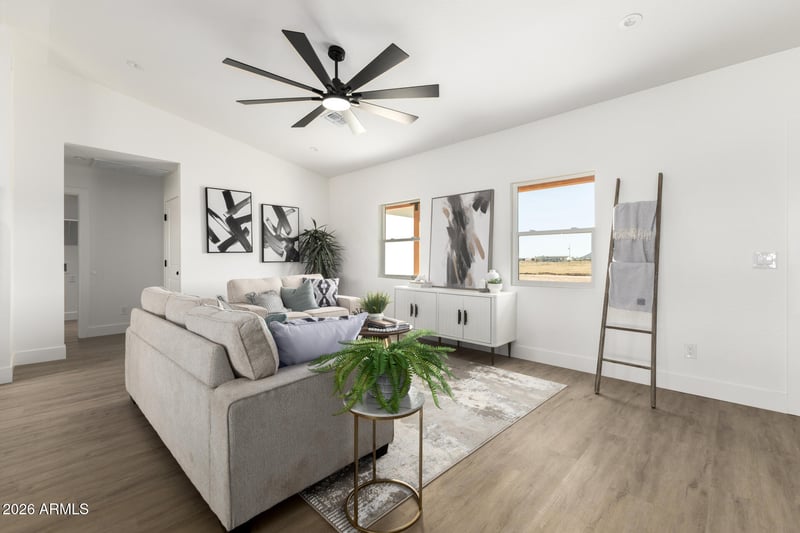 Listing details for 53848 Footprints St, Maricopa, AZ 85139 : Brand New 2026 Home - No HOA, W Trane AC! Experience wide-open desert living in this custom residence on a 1.3-acre homesite in North Hidden Valley. Set against mountain backdrops and Arizona sunsets, this location offers privacy while remaining minutes from Skydive Arizona, golf courses, the local racetrack, and Harrah's Ak-Chin Resort & Casino. Inside, the open layout includes vaulted ceilings, upgraded wood-look flooring, and a light-filled kitchen with quartz surfaces, stainless appliances, and an oversized island. Built using 2x6 framing, spray foam insulation, water filtration system, shared well, and septic. The split floor plan highlights a spacious primary suite with dual sinks, walk-in shower, and large closet. Enjoy space, views, and comfort in your own private desert escape!