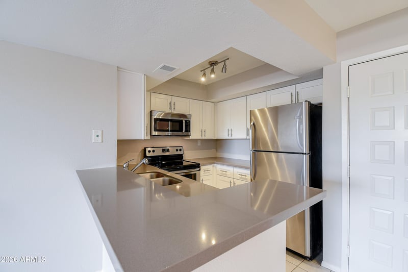 Listing details for 540 May St #2111, Mesa, AZ 85201 : WOW - Fully move-in ready and upgraded. New carpet and paint 2026! HVAC unit only 5 years old. Beautiful modern gray quartz counters. Contemporary full-face shaker-style white cabinets! Stainless steel appliances included with sale. Both full baths have updated fixtures and quartz counters too. Separate laundry room with additional storage. Two more storage closets off the full length patio. Ceiling fans in living room and both bedrooms. Elevator access too! Sloan Park, Spring Training home of The Chicago Cubs just 1/3 mile away. Arizona State University & Tempe Marketplace just 5 min drive away. 10 mins to Sky Harbor Airport via the 101 or 202 freeways. Community pool and covered parking available for residents. HOA Beautification project under-way too!