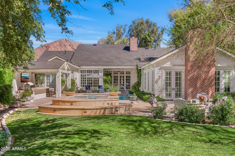Listing details for 5407 Calle Tuberia --, Phoenix, AZ 85018 : This stunning Cape Cod-inspired Arcadia residence blends timeless charm with thoughtful modern updates, set on a lush, oversized lot along a quiet, picturesque street. Light-filled interiors feature soaring ceilings, clerestory windows, and multiple French doors that create a seamless connection to the outdoors. The spectacular great room is anchored by an exquisite chef's kitchen, complemented by three fireplaces, wide plank wood flooring, beautiful millwork, and refined finishes throughout. The home offers five bedrooms plus a versatile flex room or office, along with a truly stunning primary suite designed for comfort and elegance. Recent enhancements include a new roof, a sparkling new pool, a newly built outdoor kitchen, and a beautifully designed ramada, creating an elevated indoor- -outdoor lifestyle. The backyard is a private retreat, complete with mature landscaping, a water feature, fire pit, and inviting spaces for dining and entertaining. An oversized three car side-entry garage and expansive laundry room add to the home's practicality. Located just moments from Hopi Elementary and featured in national commercials for its warmth and classic appeal, this exceptional home captures the essence of Arcadia living at its finest.