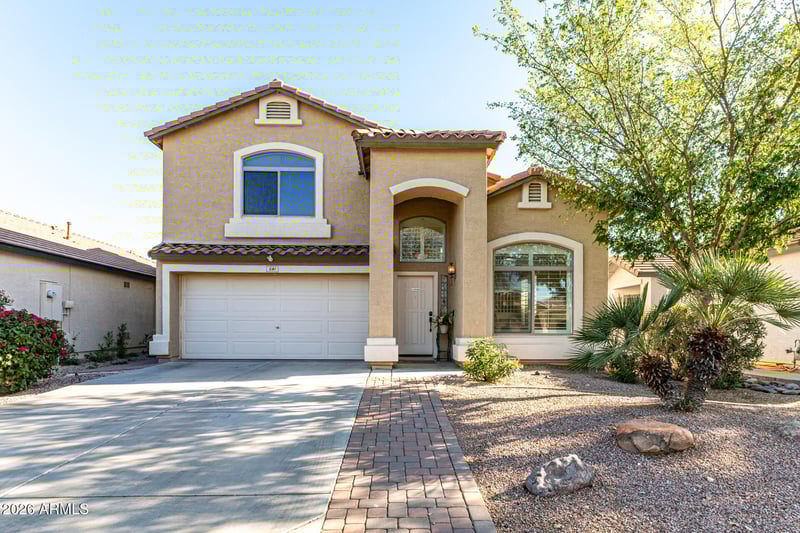 Listing details for 541 Jeanne Ln, San Tan Valley, AZ 85140 : Resort-style living starts in the backyard of this beautiful Pecan Creek home. Enjoy a large Pebble Tech pool with water feature & self-cleaning system, surrounded by lush landscaping & a spacious artificial turf area. Inside, you are welcomed by a stunning entry featuring a beautiful staircase & soaring vaulted ceilings. The home offers a spacious living & dining area filled with natural light. This 3 bedroom home plus a loft includes 2.5 bathrooms & an open family room that connects seamlessly to the kitchen, all with views of the backyard. The kitchen features granite countertops & backsplash, white cabinets, walk-in pantry, island & a breakfast counter with room for barstools. Upgraded tile flooring flows through the main living areas, & a gas fireplace adds warmth & charm. The primary suite is generously sized & offers walk-in closet & a second closet, a separate soaking tub, & a walk-in shower. Secondary bedrooms are spacious, loft is great for private space & custom shutters are featured throughout the home. New interior paint, Newer AC system, water heater & garbage disposal. With no neighbors behind, the backyard feels like a private retreat & the perfect place to relax & entertain. Located close to shopping, restaurants, and everyday conveniences, this home offers comfort, privacy, & a true resort-style lifestyle.