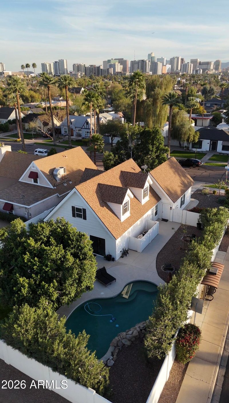 Listing details for 542 Palm Ln, Phoenix, AZ 85003 : Situated on iconic Palm Lane in the historic Willo neighborhood, this fully reimagined residence offers refined living in one of Phoenix's most prestigious communities. Thoughtfully renovated inside and out, the smart home features wood-look porcelain flooring on the main level, luxury vinyl plank upstairs, Della Terra® quartz countertops with seamless backsplash, spa-inspired porcelain baths, new black stainless steel appliances, new designer lighting and plumbing, and quad/triple-pane windows throughout. The home is equipped with Arlo for surveillance, SimpliSafe for security, Ecobee for heating/cooling, and Rainmachine for irrigation, all controlled from your phone! The open-concept main level flows effortlessly to a living room with serene backyard views. The primary suite overlooks a lush, private oasis with sparkling pool and waterfall. New landscaping includes privacy ficus hedges, roses, lavender, and red push pistache trees. Just one mile from Downtown Phoenix, with Airbnb or lease potential and a 200 sq ft unfinished attic offering future expansion. Experience the timeless elegance of Willo living.