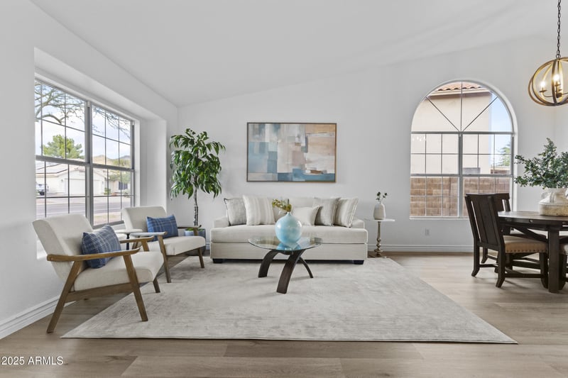 Step inside to a bright, open concept living area highlighted by a vaulted ceiling, a rounded picturesque window, and soaring archways that create an impressive sense of space and light.