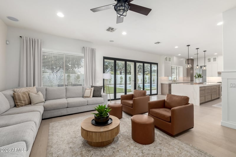 Listing details for 5421 Sandstone Ct, Gilbert, AZ 85298 : This rare basement home offers roughly 5,000 sq ft with high-end upgrades and thoughtfully curated designer finishes throughout. Custom iron railings, wide-plank wood floors, and seamless indoor-outdoor flow elevate every space. The chef's kitchen features custom oak cabinetry, porcelain waterfall countertops, oversized fridge/freezer, commercial ice maker, dual ovens, and a 36'' Thor range. A 15-foot folding iron door opens to a resort-style backyard with NEW heated pool and spa, sports court, artificial turf, and in-ground trampoline. Complete with a second primary suite, attached casita, lots of storage and a 3-car garage. Located on a cul-de-sac in the acclaimed Chandler Unified School District.