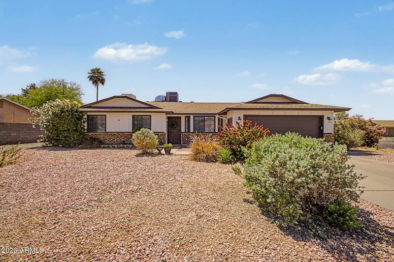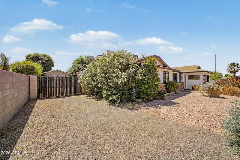 Listing details for 5433 Drummer Ave, Mesa, AZ 85206 : No HOA**Corner Lot**RV Gate**Single level, 4 bed, 2 bath home with loads of Charm! You'll love the remodeled kitchen w/ soft close drawers, breakfast bar, beautiful granite countertop, apron sink, open shelves & custom hood above the range/oven, wall cabinetry for all of your storage needs! Enjoy the vaulted ceilings, bay window in the family room, white washed brick fireplace & recessed shelving, bonus area is perfect for an office & additional storage for items that need to stay cool! 3 Guest bedrooms, an updated hall bathroom, & a large primary suite with walk-in closet, double sinks in the bathroom, more cabinetry, & walk-in tiled shower. The backyard is lush with lots of vegetation for your enjoyment & an awesome bonus shed, complete with electricity & split unit, perfect hobby room, office space, she shed, man cave and it has a bathroom w/shower. This space is not included in the square footage. The extended patio has a bump out area next to the primary bedroom with its' own private exit. This lot is nearly 1/4 acre and has lots of space on both sides of the home. You love the space between neighbors and the close proximity to shopping, schools, restaurants, airports, parks and More!!