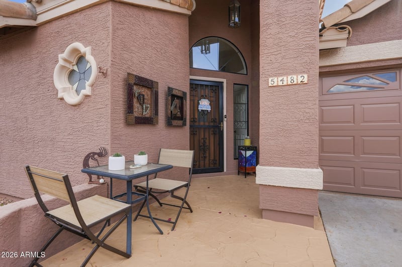 Listing details for 5482 Pyrite Cir, Gold Canyon, AZ 85118 : FURNISHED 2-bedroom home in the highly sought-after Gold Canyon area, featuring mountain views in the front and stunning sunset views in the back! This well-maintained property offers two spacious primary suites, each with its own private bathroom--ideal for guests or multi-generational living. Step inside to a bright and inviting interior with vaulted ceilings, brand new updated quality dual-pane windows, tile and new vinyl flooring throughout, and abundant natural light. The open great room provides a comfortable space for relaxing or entertaining. The well-appointed kitchen showcases crisp grey cabinetry, updated countertops, a stylish backsplash, generous counter space, and newer refrigerator and dishwasher.