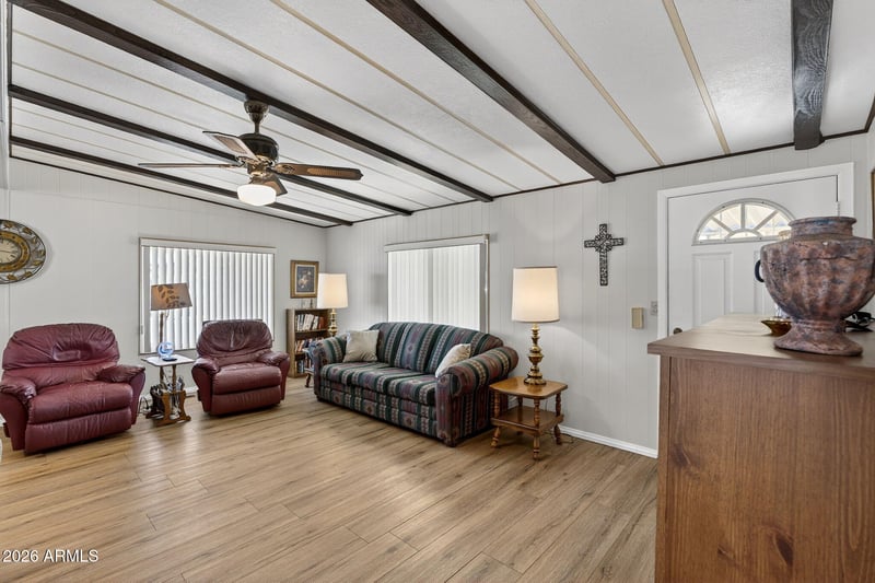 Listing details for 5504 Aspen Ave, Mesa, AZ 85206 : Own your land in the desirable 55+ community of Velda Rose Gardens. This 2 bedroom, 2 bathroom manufactured home features a functional layout with comfortable living and dining spaces, updated easy-care flooring, and a deep covered carport. A rare oversized shed offers exceptional flexibility and is large enough for a small car, golf cart, workshop, or extra storage. Key updates include AC (2020), permanent roof (2010), reinforced sub-flooring, exterior paint (2020), and security screen doors. Refrigerator, washer, and dryer convey. Seller open to selling furnished. Enjoy community pool and clubhouse plus convenient access to shopping, dining, medical services, and freeways.