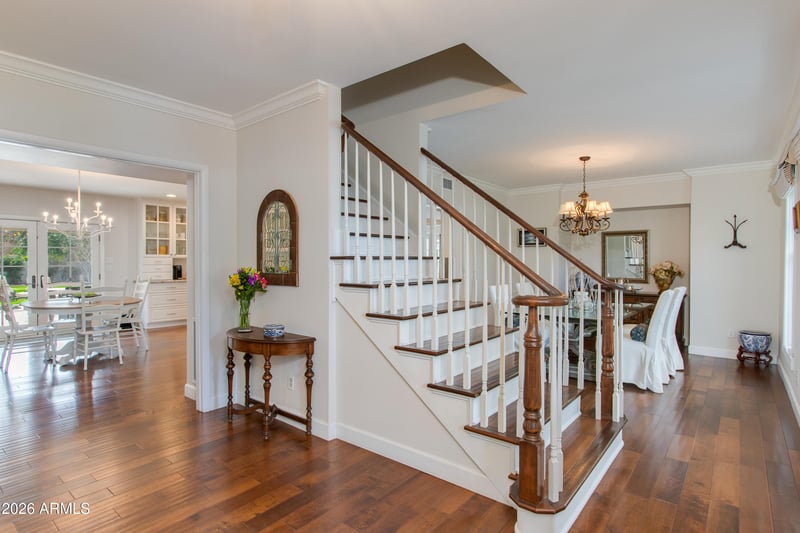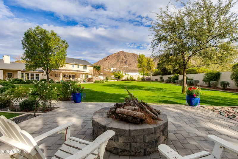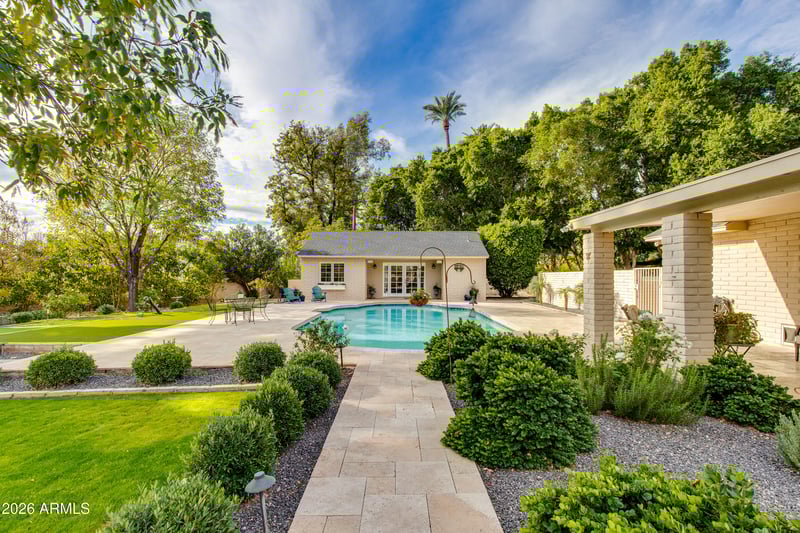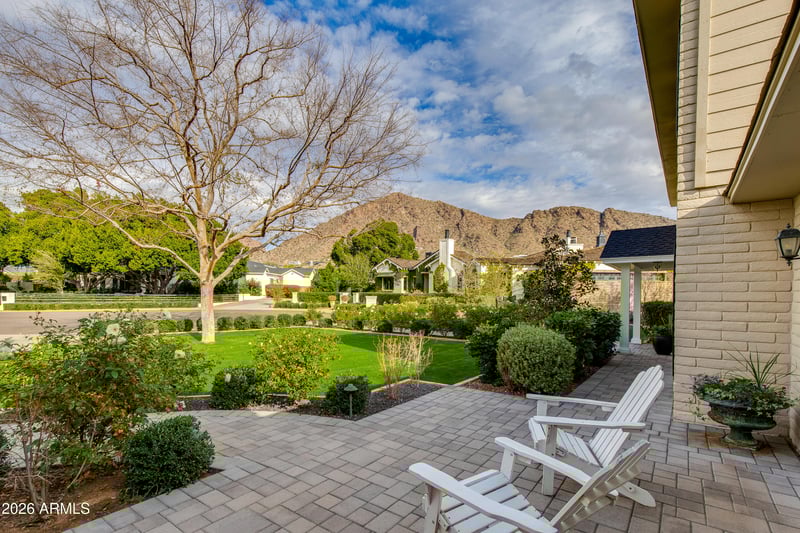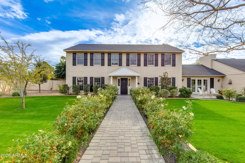 Listing details for 5517 Mariposa St, Phoenix, AZ 85018 : Welcome to 5517 E Mariposa Street, a timeless Colonial-style home set on an expansive 35,000 sq ft cul-de-sac lot. This exceptional residence features four bedrooms plus a dedicated office, anchored by a classic traditional floorplan with a formal foyer, living room, and separate dining room in the main house. The inviting family room exudes warmth and character with rich wood flooring, a fireplace, built-in shelving, and French doors that open to both a charming front courtyard with views of Camelback Mountain and a rear patio overlooking the pool. The bright kitchen is thoughtfully designed with updated appliances and a cozy breakfast room flanked by double French doors, creating effortless indoor-outdoor flow. Completing the property is a fully equipped guest house with its own living room, bedroom, and bathroom. This space is ideal for extended guests, multigenerational living, or a private home office or studio. The backyard is truly a dream, featuring a sparkling pool, putting green, built-in BBQ, firepit, and sweeping views of Camelback Mountain. A rare opportunity to own a gracious, character-filled Arcadia estate on one of the area's most coveted oversized lots, blending timeless architecture with an exceptional lifestyle setting.