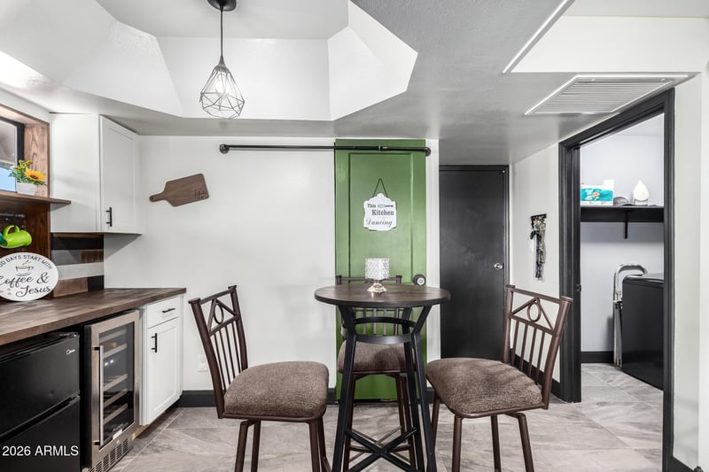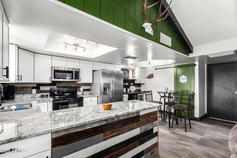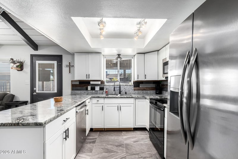 Listing details for 5549 Drummer Ave, Mesa, AZ 85206 : Discover your dream house! This newly remodeled 3-bedroom offers 1332 sf of comfortable living space. Featuring a family room w/a wood burning stone fireplace, wood beamed vaulted ceilings, & tile flooring. Kitchen boasts granite countertops, new white shaker cabinets, ss appliances, butcher block coffee bar, & distressed wood backsplash, other amenities incl barn doors, lots of natural light, plantation blinds, granite counters in bathrooms, updated tile/stone shower in master, coffered ceiling in master bedroom, bay windows in master w/ built in storage seat, window seat in living room, sky light in guest bath, updated plumbing & electrical fixtures t/o. New paint in 2026, quarter acre lot w/ oversize diving pool, rv parking, 2 RV gates & room for all your toys.