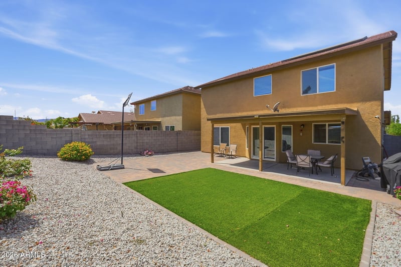 Listing details for 5603 27th Dr, Phoenix, AZ 85041 : Great home in Baseline Corridor with no rear neighbors! Home offers a great floor plan with living room upon entry, open kitchen to family room and 5th bedroom & full bathroom downstairs. Upstairs has large loft area, 4 bedrooms including primary suite. Kitchen is upgraded with dark cabinets, granite slab countertops and tiled backsplash. Home has large 20'' ceramic tile throughout, with wood flooring upstairs. Paid off solar panels provide immediate electric savings to buyer! Nicely appointed backyard has turf area, covered patio and extended paver area, perfect for entertaining or play!
