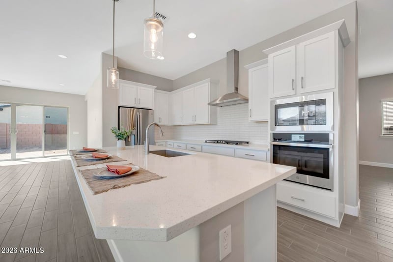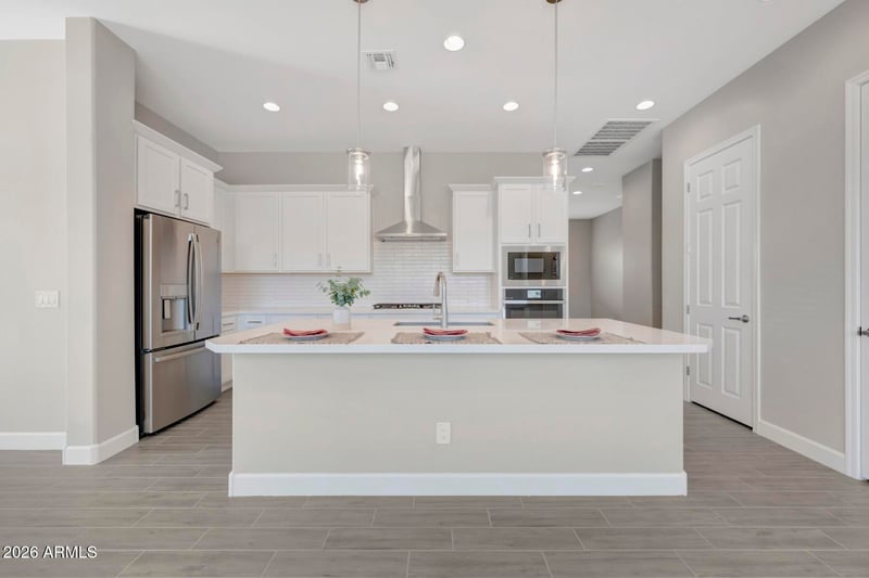 Listing details for 5607 193rd Ave, Litchfield Park, AZ 85340 : GORGEOUS BRAND NEW 3 bed, 2 bath with enclosed study, flex retreat area and 2 car garage located across the street from a beautiful green belt and park; modern white cabinets in kitchen with clean subway backsplash; upgraded plant tile flooring, upgraded carpet/pad throughout; 8' doors, 10' ceilings 5 1/4'' baseboards and designer selected finishes; washer, dryer, refrigerator and whole home blinds throughout; stainless GE appliances including gas cooktop; gorgeous tiled shower shower in owner's bath; 2x6 construction and extensive new home warranty.