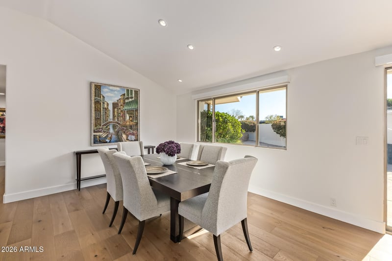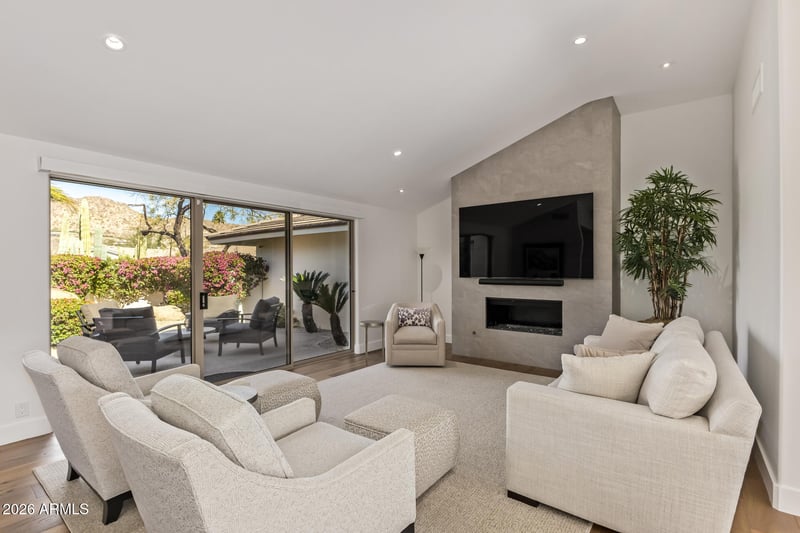The light-filled open floor plan showcases vaulted ceilings and a redesigned gourmet kitchen with custom cabinetry, Sub-Zero refrigeration, Wolf appliances, ASKO dishwasher, quartzite countertops, a wet bar, reverse osmosis water system, and Pentair water softener. The expansive primary suite includes his and her baths, dual oversized walk-in closets, and spa-inspired finishes. The primary bath and laundry were fully remodeled with new tile and fixtures. Additional upgrades include engineered plank flooring, Austin Morgan closets, solid wood interior doors, Hunter Douglas blinds, a 42" linear gas fireplace, Cat-6 wiring throughout, hard-wired security and smoke systems, and an oversized garage with Lift Pro Carousel parking and golf cart space. Residents enjoy access to Mountain Shadows Resort amenities and close proximity to El Chorro, Sanctuary, Camelback Inn, Old Town Scottsdale, and Fashion Square.