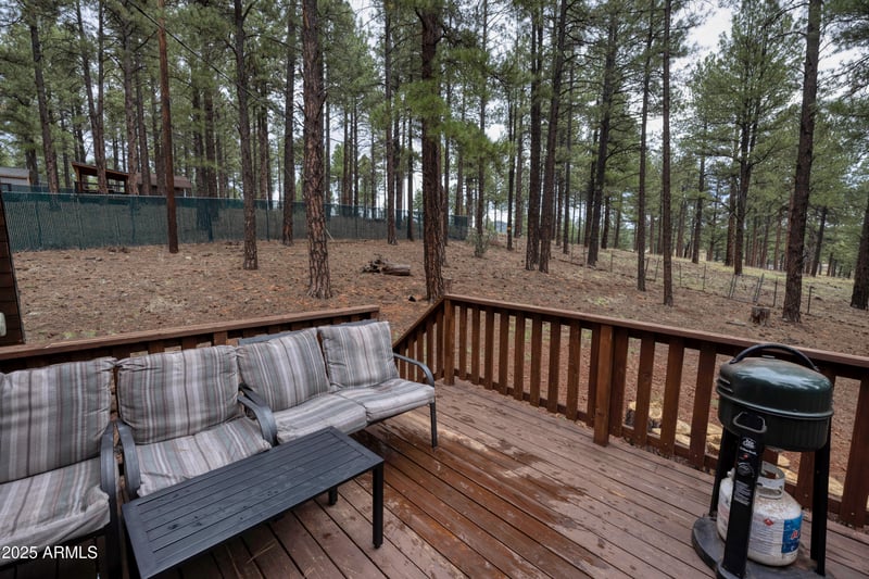 Listing details for 569 Friar Tuck Trl, Williams, AZ 86046 : Discover your ultimate high-country escape in Sherwood Estates, a private enclave just 10 minutes from Williams, AZ. This furnished cabin is completely immersed in the majestic Kaibab National Forest, offering unparalleled seclusion. Your backyard is the national forest! Step directly from the open-concept main level—featuring the kitchen, dining, living room, and a full bath—onto the expansive back deck. At 7000', inhale the pure, pine-scented mountain air and savor the tranquility. Inside, a crackling wood-burning stove keeps the entire home toasty warm, circulating heat naturally to the upstairs bedrooms. Ready for immediate enjoyment or as a proven part-time Airbnb, this retreat offers incredible income potential. Horses are welcome!