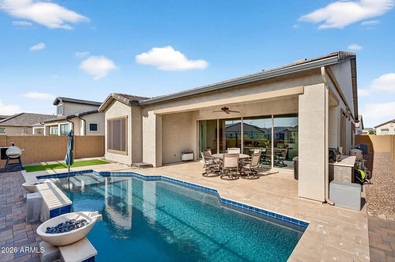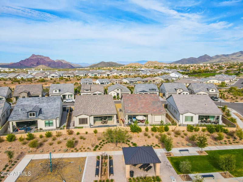 Listing details for 5721 Scarlet St, Mesa, AZ 85215 : Welcome to this stunning, single-level luxury home built in 2023 and located in the highly desirable Red Rock Reserve by Blandford Homes. This 3 bedroom, 2.5 bathroom residence offers 2,035 square feet of thoughtfully designed living space and a rare 3-car tandem garage. Step inside through the dramatic iron entry door to an open and airy floor plan featuring plank tile throughout, 8-foot interior doors, oversized baseboards, and an expanded great room highlighted by a breathtaking 20-foot wall of glass. The gourmet kitchen is a showstopper with upgraded Regal White cabinetry, quartz countertops, soft-close drawers, and a premium KitchenAid 36-inch gas cooktop package. The primary suite offers a spa-inspired bath with a large walk-in shower, modern rectangular sinks, and framed mirrors. Over $20,000 in custom window coverings are included, featuring electronic shades on the wall of glass. Additional upgrades include a water softener and reverse osmosis system.