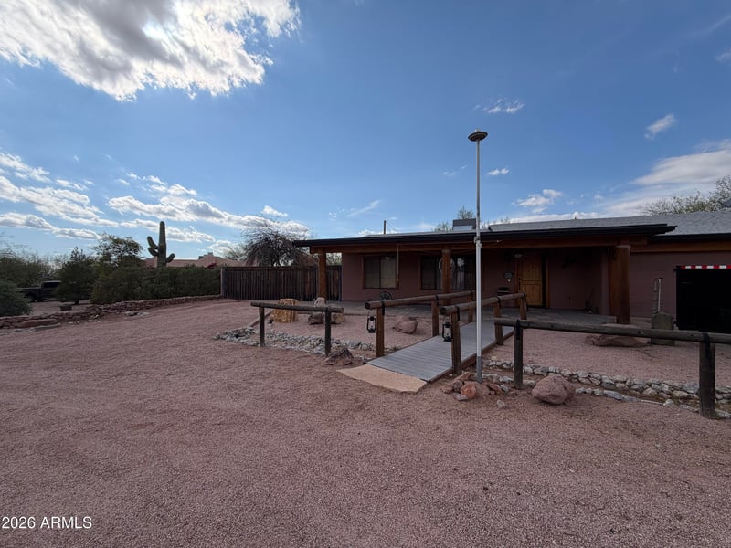 Listing details for 5724 El Camino Quinto Ave, Apache Junction, AZ 85119 : Nestled in Apache Junction with breathtaking views of the Superstition Mountains, this is a unique southwestern style home. The home is in need of some interior remodeling but will make a serene mountain haven. Open floor plan, separate living quarters, custom front and back deck, RV gates, custom fire pit, and over 1,000 square foot shop with RV doors. This is a must see!