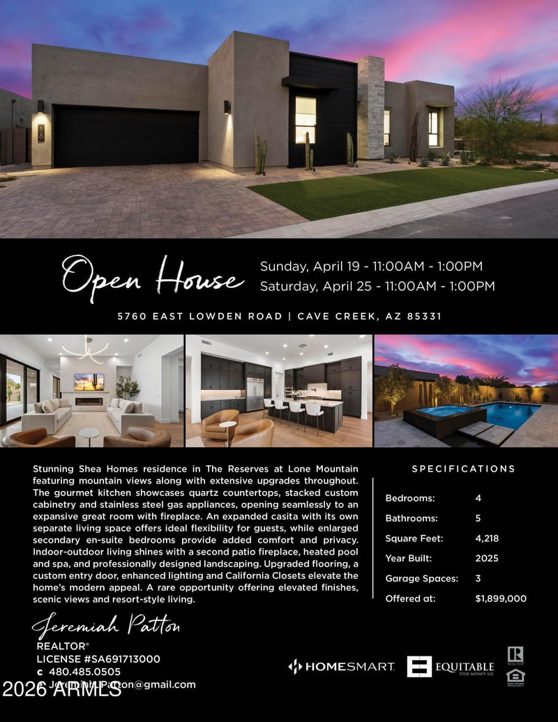 Listing details for 5760 Lowden Rd, Cave Creek, AZ 85331 : Premium corner lot. New construction 1-year builder warranty transfers through mid-July. Stunning Shea Homes residence in The Reserves at Lone Mountain with mountain views and extensive upgrades throughout. Gourmet kitchen features quartz countertops, stacked custom cabinetry, and stainless steel gas appliances, opening to an expansive great room with fireplace. Expanded casita with separate living space offers flexibility for guests, while enlarged en-suite secondary bedrooms add comfort and privacy. Enjoy indoor-outdoor living with a second patio fireplace, heated pool and spa, and professional landscaping. Upgraded flooring, custom entry door, lighting, and California Closets enhance the home.