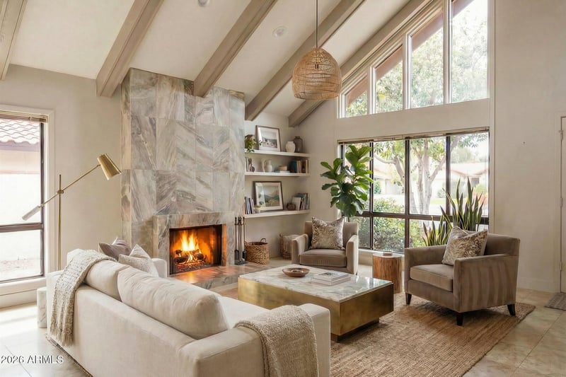 Listing details for 5770 Scottsdale Rd, Paradise Valley, AZ 85253 : Thoughtfully remodeled with luxury-level finishes, cabinetry, hardware, and refined fixtures, complemented by a brand-new A/C system and electronic roller shades throughout. This premium lock-and-leave home is ideally situated in the center of the subdivision on one of the two largest lots within the gated community with views of Camelback Mountain from the patios! Expansive outdoor spaces include a welcoming entry courtyard patio, wraparound side to rear patio that backs to a wide-open community park area with a direct walking path to the heated pool, spa, and clubhouse with workout facility. These multiple oversized terraces create seamless indoor-outdoor entertainment areas complimented by vaulted ceilings and abundant natural light!