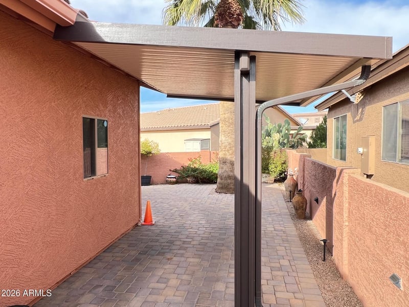 Listing details for 5802 Montara Pl, Mesa, AZ 85215 : Honey, stop the car! This home needs to be shown to your fussiest buyers! Incredibly open concept on this 2 bedroom + den, 2 bath beauty. New A/C in 2023; mini-split A/C in garage in 2022; newer tankless water heater and water softener. In 2025 the attic was insulated with R-25 insulation; new toilets were installed; and the house was repainted. Upgraded interior window shades. Insulated garage door. Golf cart canopy with paved driveway for the golf cart. ADT alarm and cameras at garage, back patio and side yard. Wait until you see the secluded back yard oasis, with privacy trees. Oh, and there is a doggy door for your furry friends and the back yard is fenced in. Pocket sliding door into the garage from the hallway. Tucked away off the beaten path. This one is a gem!!!