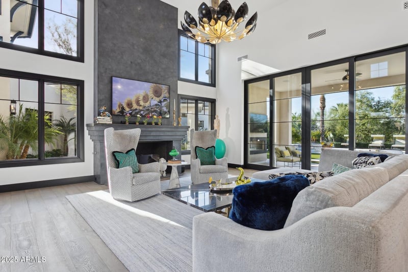 Listing details for 5842 38th Pl, Paradise Valley, AZ 85253 : Don't miss this recently constructed and lightly lived-in Candelaria Design, built by Barkan Construction, now offered as an exceptional resale, capturing candy-colored sunsets from every angle. Thoughtfully positioned on over an acre, the home unfolds along a central gallery hall that reveals multiple courtyards and outdoor living spaces, all oriented to frame dramatic views of Camelback and Piestewa Peak. At the heart of the home, the great room seamlessly connects to the kitchen, bar, and family room. Exposed beams sweep across the ceilings from the broad Venetian plaster fireplace to the generously scaled kitchen hood, creating a warm yet refined atmosphere. Custom cabinetry and designer finishes run throughout. The working ''back kitchen'' is ideal for entertaining, featuring double Wolf ovens, a warming drawer, and a third sink.